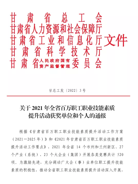 1月21日,甘肅省總工會(huì)、省人力資源和社會(huì)保障廳、省工業(yè)和信息化廳、省科學(xué)技術(shù)廳、省人民政府國(guó)有資產(chǎn)監(jiān)督管理委員會(huì)聯(lián)合公布了《關(guān)于2021年全省百萬(wàn)職工職業(yè)技能素質(zhì)提升活動(dòng)獲獎(jiǎng)單位和個(gè)人的通報(bào)》,石化集團(tuán)專(zhuān)精特新公司孫占棟、劉恒、林占強(qiáng)、駱振璽、劉恒5名職工榮獲“2021年甘肅省技術(shù)標(biāo)兵”稱(chēng)號(hào)。