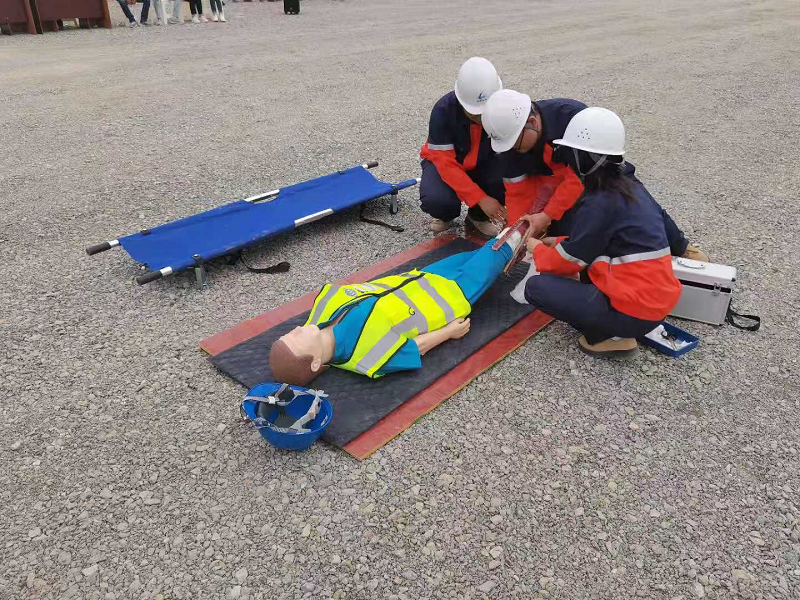 演練地點選擇存在高處作業(yè)風(fēng)險的裝卸車棧臺管廊橋架,模擬了施工人員不慎從高處作業(yè)平臺墜落的情景。事故發(fā)生后,現(xiàn)場安全巡檢人員第一時間向應(yīng)急救援領(lǐng)導(dǎo)小組組長報告,組長立即啟動應(yīng)急救援預(yù)案。各小組奔赴現(xiàn)場后,立即分析現(xiàn)場情況,警戒組拉設(shè)警戒線封鎖現(xiàn)場,醫(yī)療救護(hù)組立即對傷著進(jìn)行現(xiàn)場急救,工程搶險組對現(xiàn)場道路進(jìn)行疏通,各救援小組各司其職,迅速開展應(yīng)急救援和搶險。