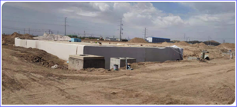 廢水處理站由初期雨水池(有效容積490m3)和事故水池(有效容積1715m3)組成。池壁、底板、頂板通過三層長絲無紡?fù)凉げ?,兩層土HDPE土工膜做防腐防滲處理。水池注水至雨水池和事故水池連接處,沉降觀測(cè)一周,池主體無滲漏后用潛水泵抽水放至現(xiàn)場。水池閉水過程嚴(yán)格按照閉水方案進(jìn)行,并制定了防水現(xiàn)場應(yīng)急處置措施。
