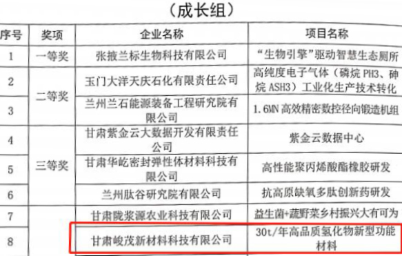 近日,從第十一屆中國(guó)創(chuàng)新創(chuàng)業(yè)大賽(甘肅賽區(qū))組委會(huì)獲悉,蘭州新區(qū)專精特新化工產(chǎn)業(yè)孵化基地的兩家入駐企業(yè)——甘肅峻茂新材料科技有限公司和蘭州昱重醫(yī)藥科技有限公司分別榮獲第十一屆中國(guó)創(chuàng)新創(chuàng)業(yè)大賽(甘肅賽區(qū))優(yōu)秀企業(yè)獎(jiǎng)。