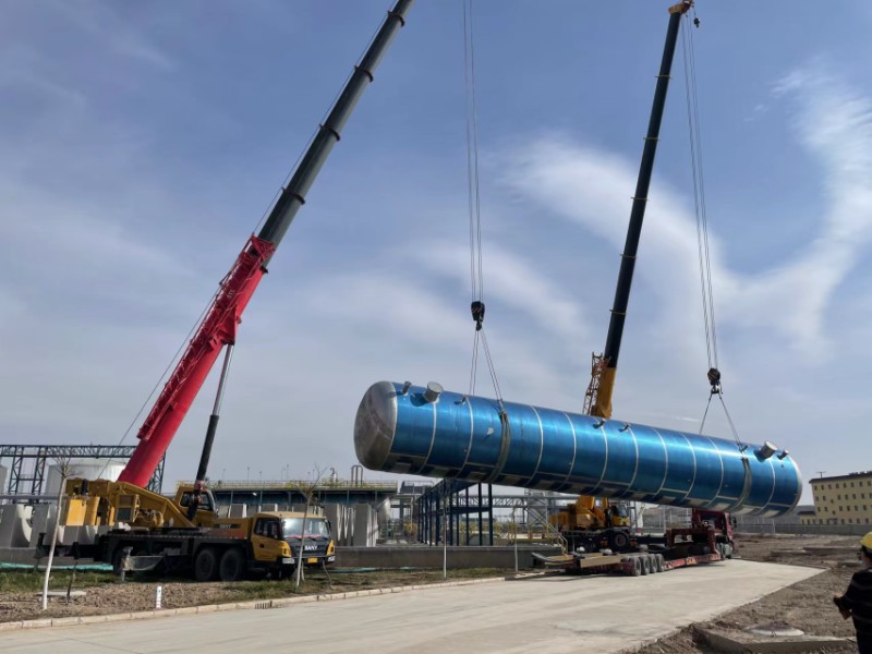 近日,疫情防控形勢復雜嚴峻,這對于物流園貨場項目建設來說,壓力極大。設備到貨時間延長,施工工地人員密集,流動性大,項目建設面臨材料、設備、人員等多重壓力。化工商貿(mào)公司多方協(xié)調(diào),克服種種困難,終于于11月15日,硝酸儲罐順利運抵物流園貨場。檢查吊車司機、運輸司機等“兩碼”正常并按要求報備后,物流園貨場立即安排,各種機械輪番作業(yè),公司職工和施工單位人員在工地上揮汗奮戰(zhàn),整個施工現(xiàn)場繁忙而有序,經(jīng)過了十二個小時的奮戰(zhàn),克服了吊裝過程中種種困難。在公司領導、項目部技術人員的協(xié)同下,物流園貨場罐區(qū)主體工程之一——直徑4米、高度近24米、吊裝總重量近30噸的硝酸儲罐順利吊裝并精準落位。截止發(fā)稿,新安裝硝酸儲罐已進行罐頂蓋板和防護欄桿焊接作業(yè),預計月底,硝酸儲罐所有輔助設施將全部完成。